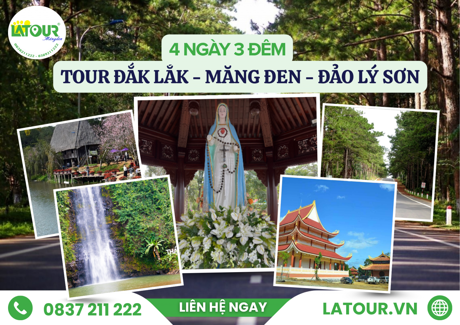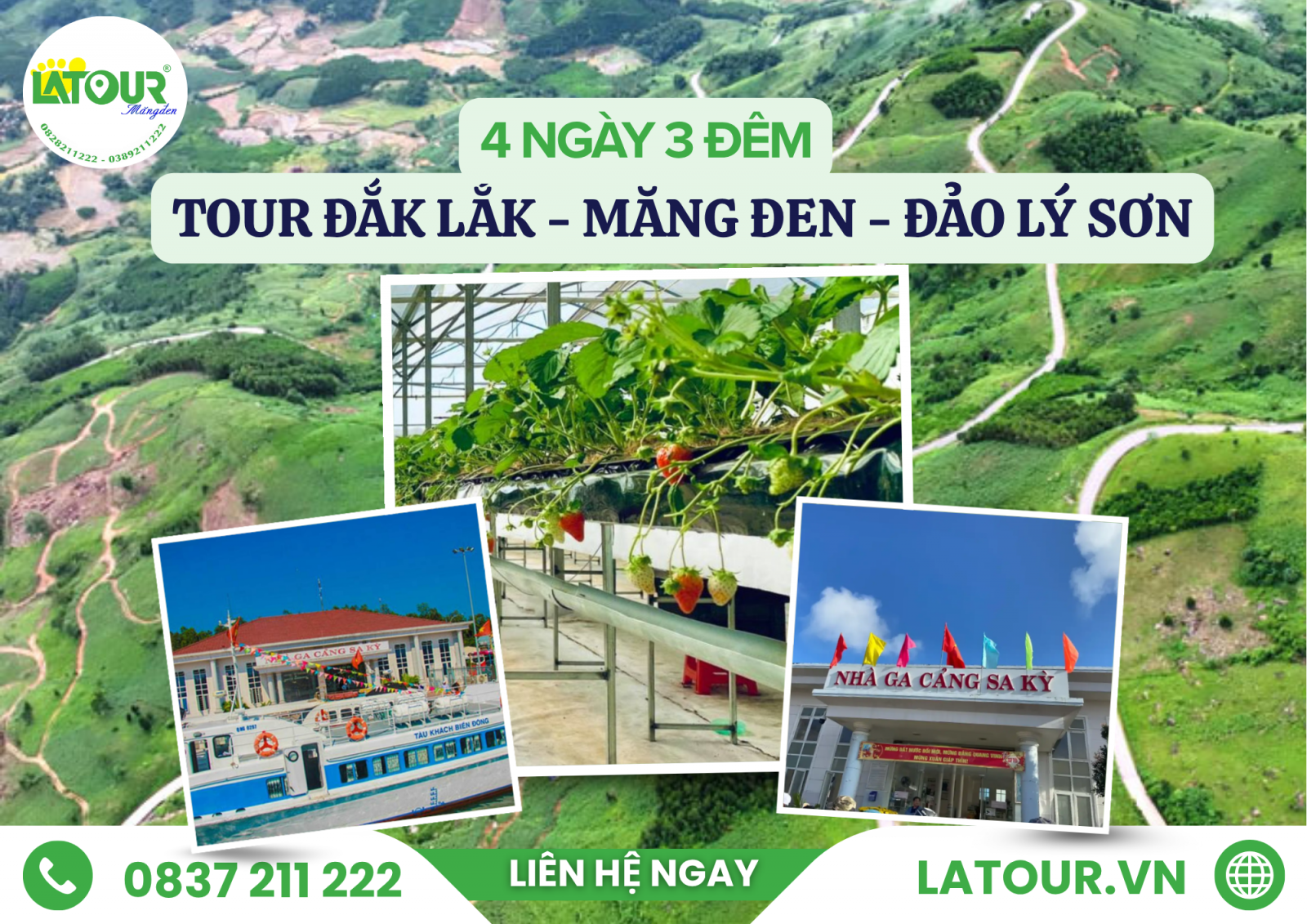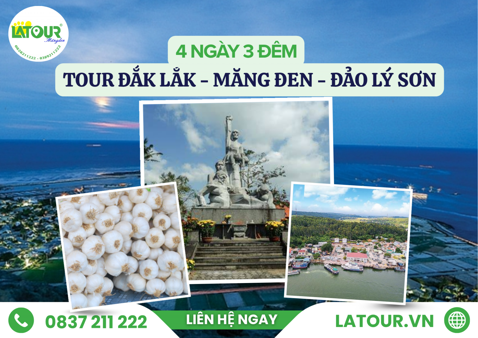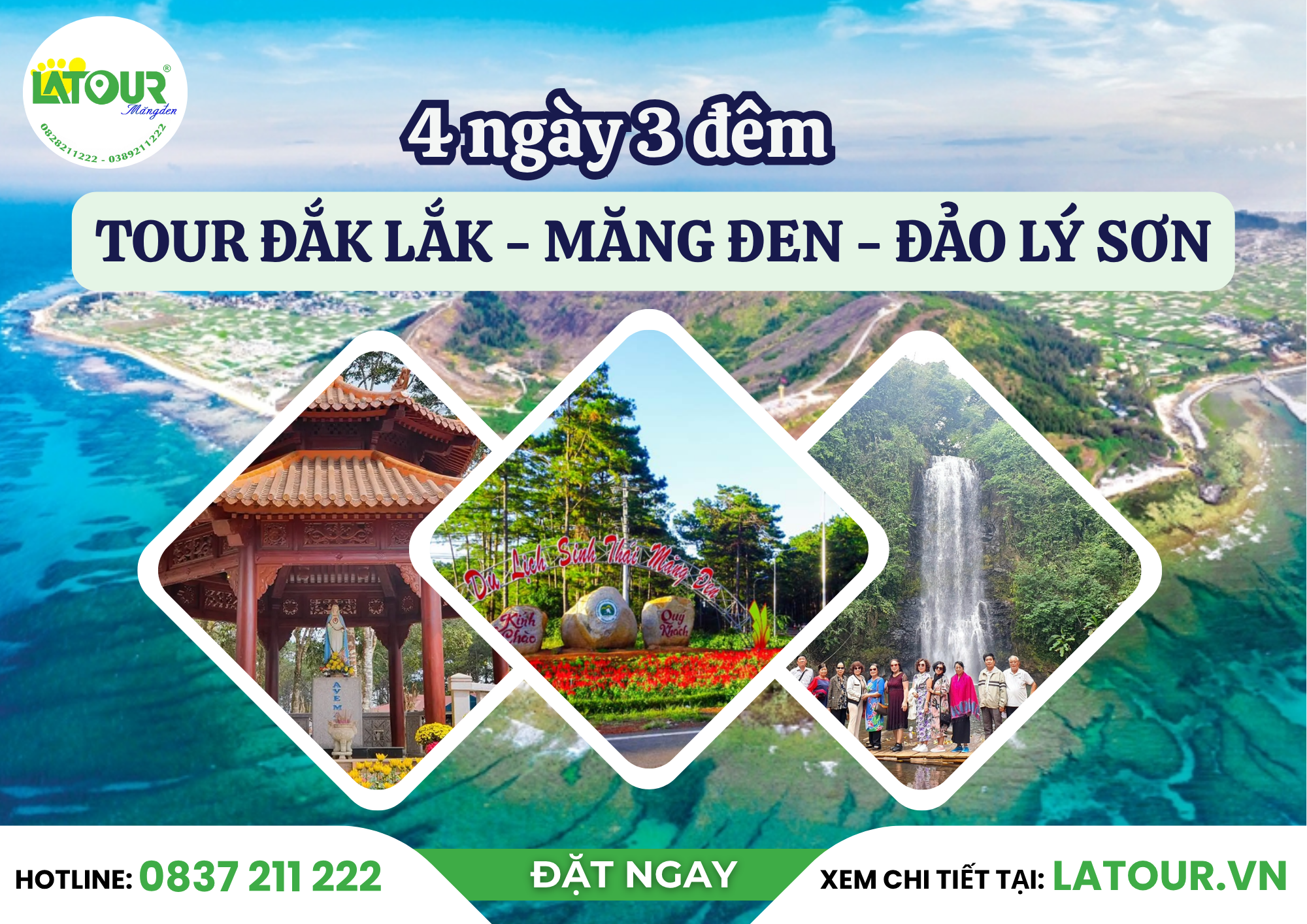 Bước vào hành trình Tour Đắk Lắk – Măng Đen – Đảo Lý Sơn 4 ngày 3 đêm, chuyến du lịch cùng LATOUR đưa bạn qua những miền đất mang hơi thở riêng của thiên nhiên Việt Nam. Cơ hội đặt chân đến cao nguyên Măng Đen dịu dàng trong sương sớm đến hòn đảo Lý Sơn rực rỡ giữa làn nước biếc, mỗi điểm đến đều mở ra một khung trời cảm xúc mới. Tour Măng Đen - Đảo Lý Sơn khởi hành từ Đắk Lắk là sự giao hòa giữa núi rừng và biển cả, giữa sự tĩnh lặng và sức sống, giữa khám phá và nghỉ dưỡng.