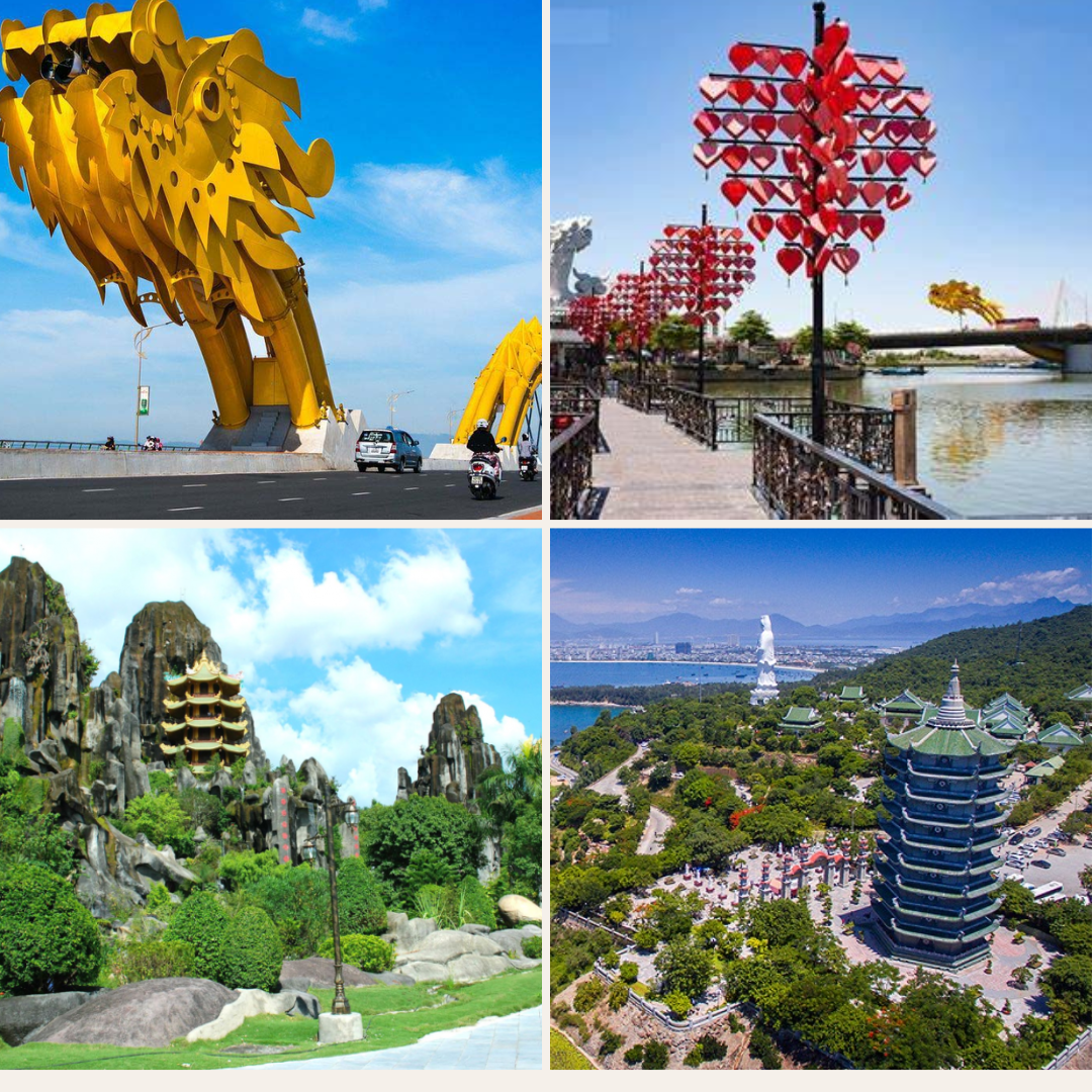 Cầu Rồng: Là một biểu tượng nổi bật của Thành phố Đà Nẵng, cầu mang hình dáng một con rồng vàng uốn lượn vươn mình qua sông Hàn, biểu tượng cho sức mạnh và thịnh vượng.