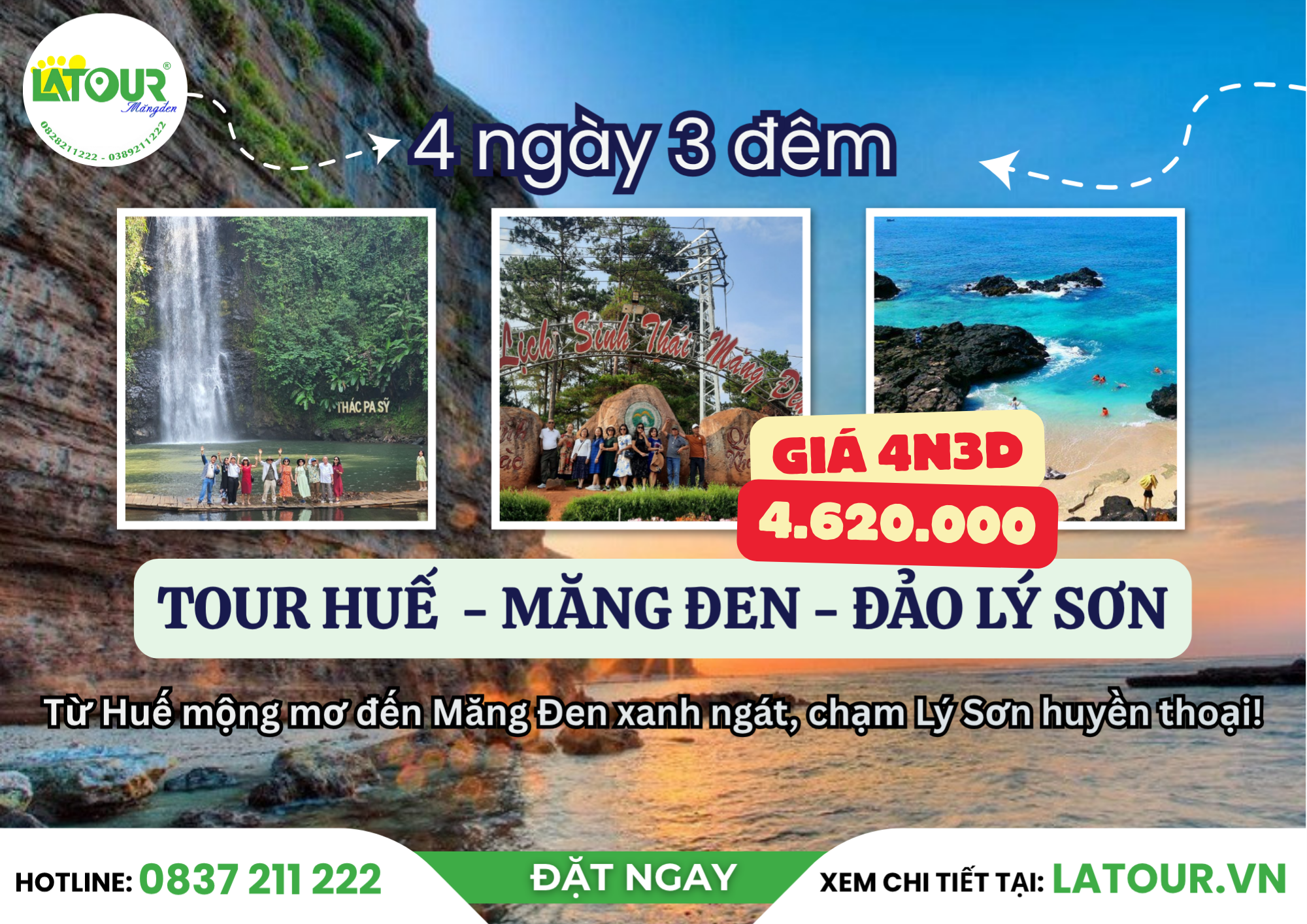 Theo bước LATOUR, bắt đầu hành trình tìm về những miền đất mang vẻ đẹp nguyên sơ và bình yên trong Tour Huế – Măng Đen – Đảo Lý Sơn 4 ngày 3 đêm. Đắm mình trong không gian xanh ngát của rừng thông Măng Đen, tận hưởng làn sương sớm vờn qua triền đồi và hồ nước tĩnh lặng, đến sắc biếc dịu êm của biển trời Lý Sơn, một khung cảnh mới mẻ, chứa đựng nét đẹp tinh khôi của thiên nhiên miền Trung.