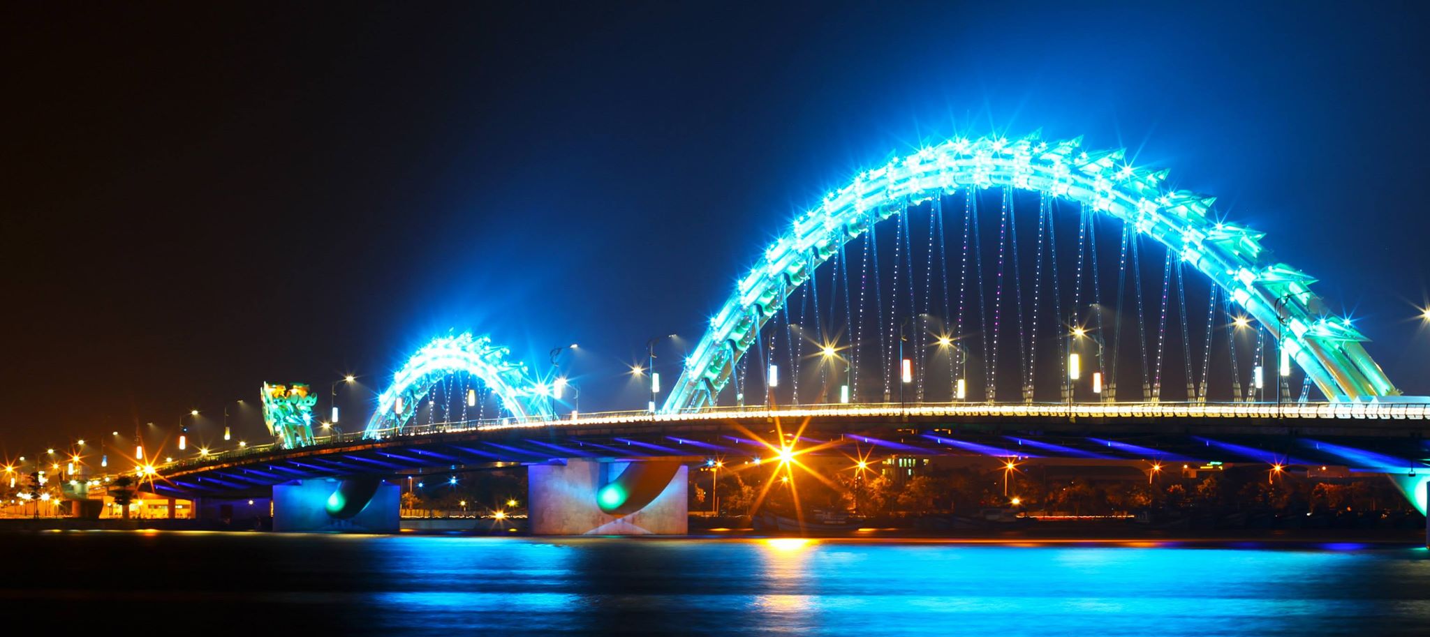 Cầu Rồng: Là một biểu tượng nổi bật của Thành phố Đà Nẵng, cầu mang hình dáng một con rồng vàng uốn lượn vươn mình qua sông Hàn, biểu tượng cho sức mạnh và thịnh vượng. Cầu Rồng không chỉ ấn tượng bởi kiến trúc mà còn bởi khả năng phun lửa và nước vào các tối cuối tuần, tạo nên khung cảnh ngoạn mục.