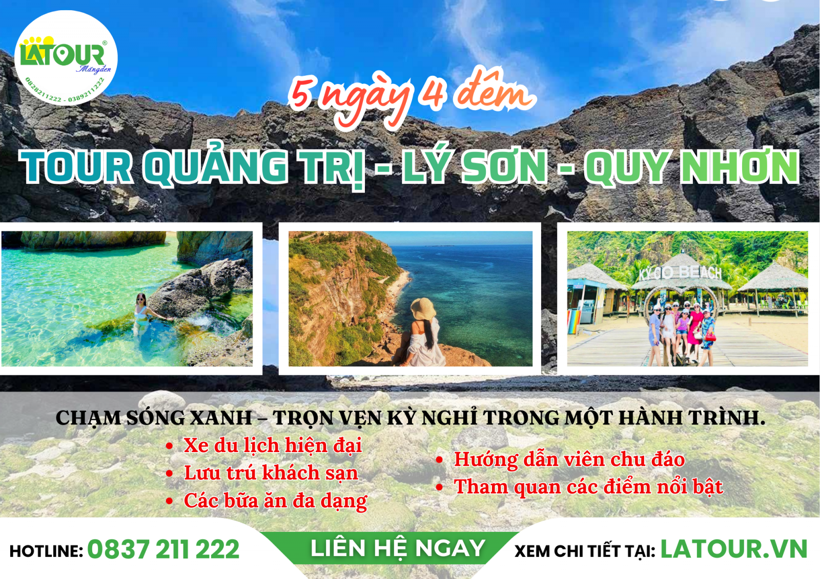 Tham gia Tour Quảng Trị - Lý Sơn - Quy Nhơn 5 ngày 4 đêm cùng LATOUR, chuyến du lịch đưa du khách đến với hai gam màu đối lập nhưng hài hòa của miền Trung. Một Đảo Lý Sơn mở ra không gian biển đảo thuần khiết, khám phá những dấu tích núi lửa cổ tạo nên cảnh quan khác biệt và ấn tượng. Tận hưởng góc nhìn mới giữa trời xanh, biển biếc và đá đen đặc trưng. Và một Quy Nhơn chào đón quý khách bằng vẻ đẹp yên bình xen lẫn nhịp sống hiện đại. Chiêm ngưỡng những bãi biển trong xanh, ghềnh đá và điểm tham quan văn hóa tạo nên trải nghiệm thư giãn nhưng không hề đơn điệu.