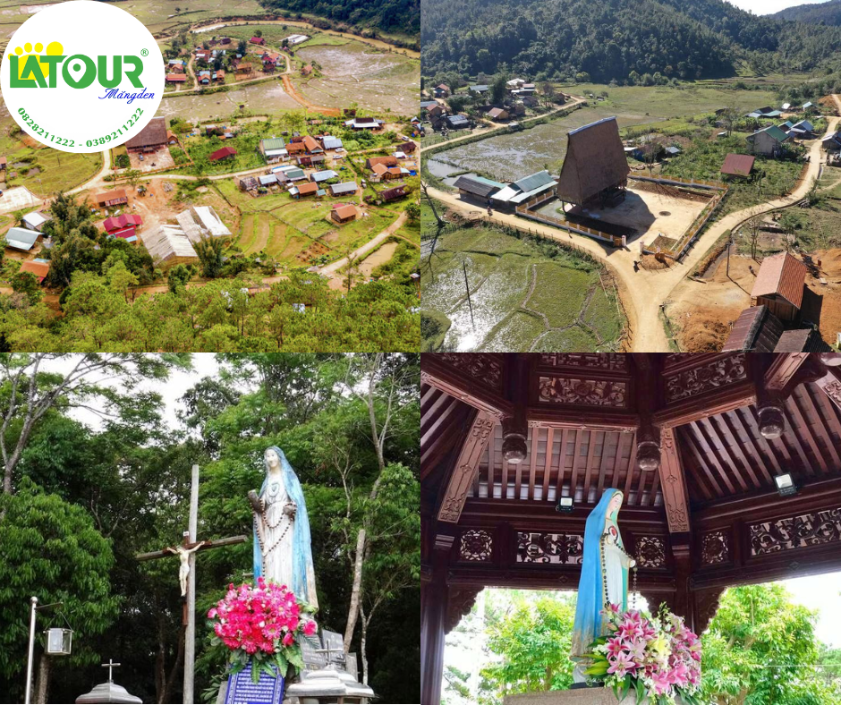 - Tượng Đức Mẹ Măng Đen: Tượng Đức Mẹ Măng Đen là điểm đến linh thiêng, thu hút cả du khách lẫn những người hành hương. Với vẻ đẹp giản dị và cổ kính, bức tượng gắn liền với những câu chuyện về bình an và lòng thành kính, mang đến không gian thanh tịnh và trang nghiêm cho bất cứ ai ghé thăm.