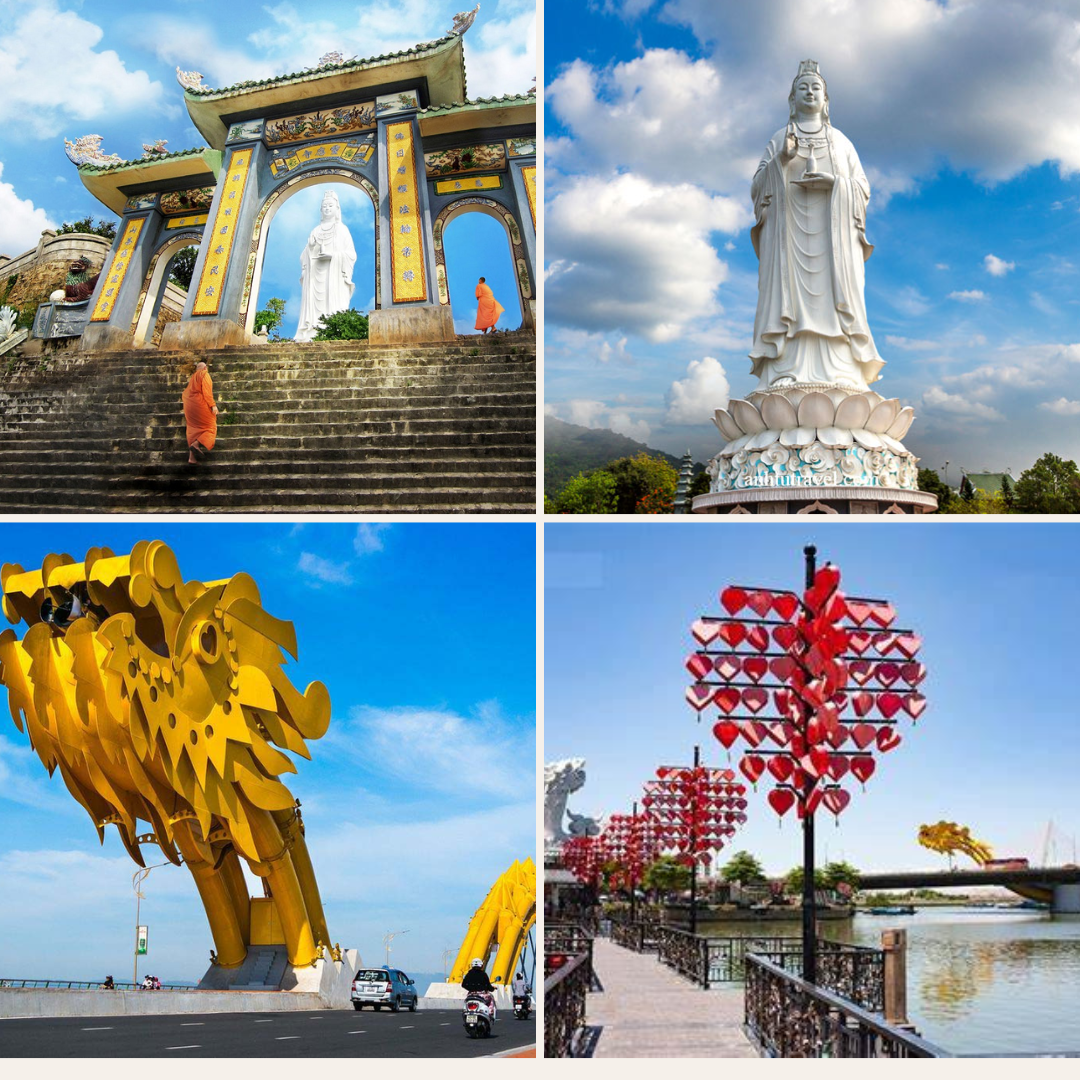 • Chùa Linh Ứng: nằm trên bán đảo Sơn Trà, là ngôi chùa nổi bật và linh thiêng nhất trong ba ngôi chùa Linh Ứng tại Đà Nẵng. Với thế đất tựa lưng vào núi, mặt hướng ra biển, chùa không chỉ là điểm đến tâm linh mà còn là một nơi sở hữu cảnh quan thiên nhiên tuyệt vời. Điểm nhấn trong khuôn viên chùa là tượng Phật Quan Thế Âm cao 67m, được công nhận là bức tượng Phật lớn nhất Việt Nam. Đây là một địa điểm lý tưởng để du khách tìm đến cầu bình an, tìm kiếm sự tĩnh lặng trong tâm hồn, đồng thời tận hưởng cái nhìn toàn cảnh về thành phố Đà Nẵng từ độ cao tuyệt vời.