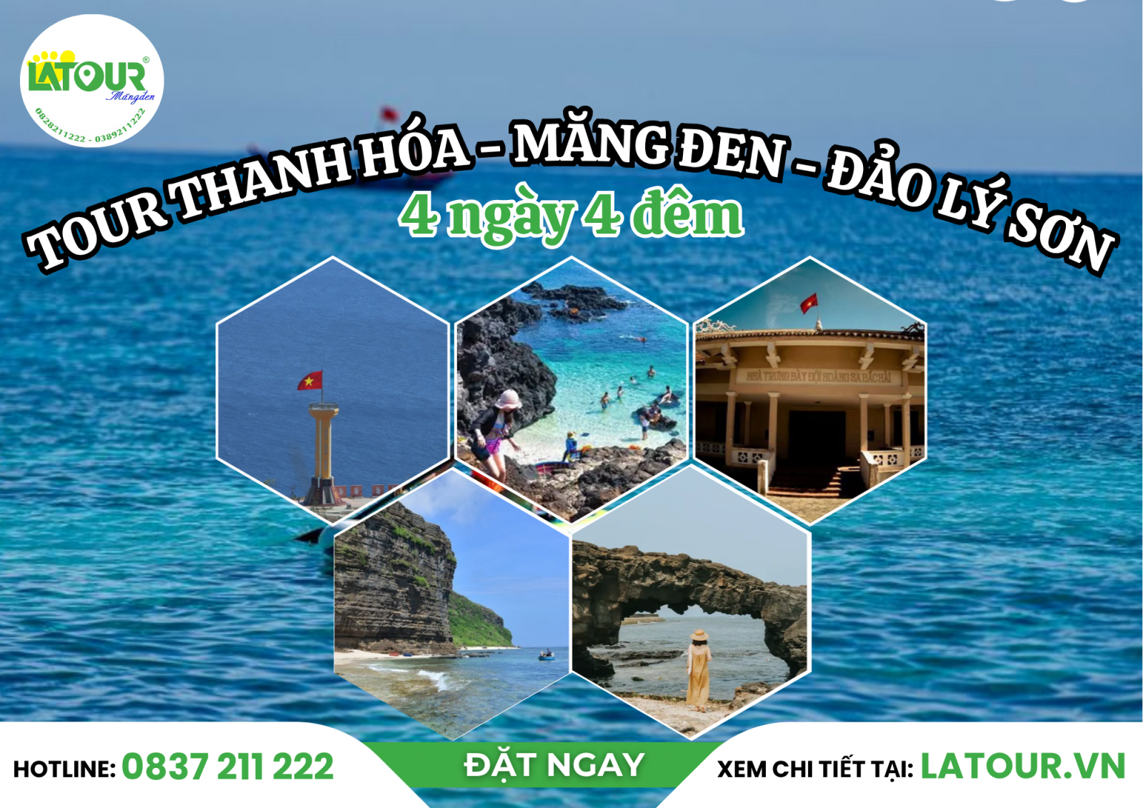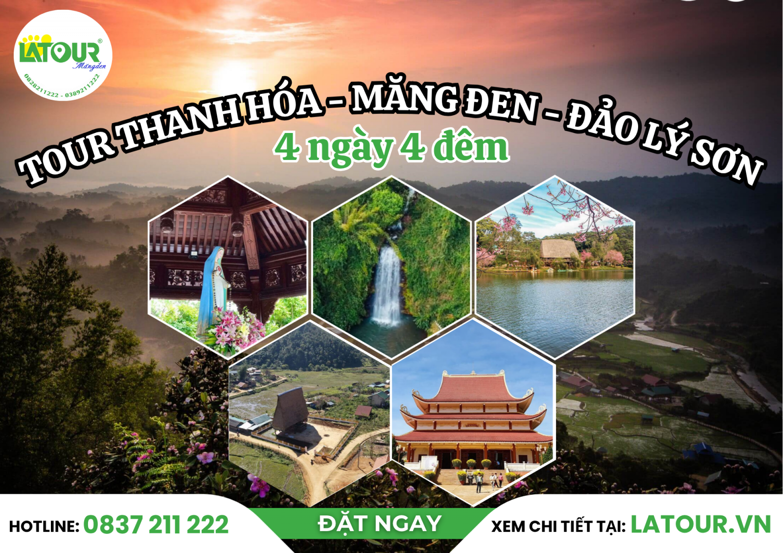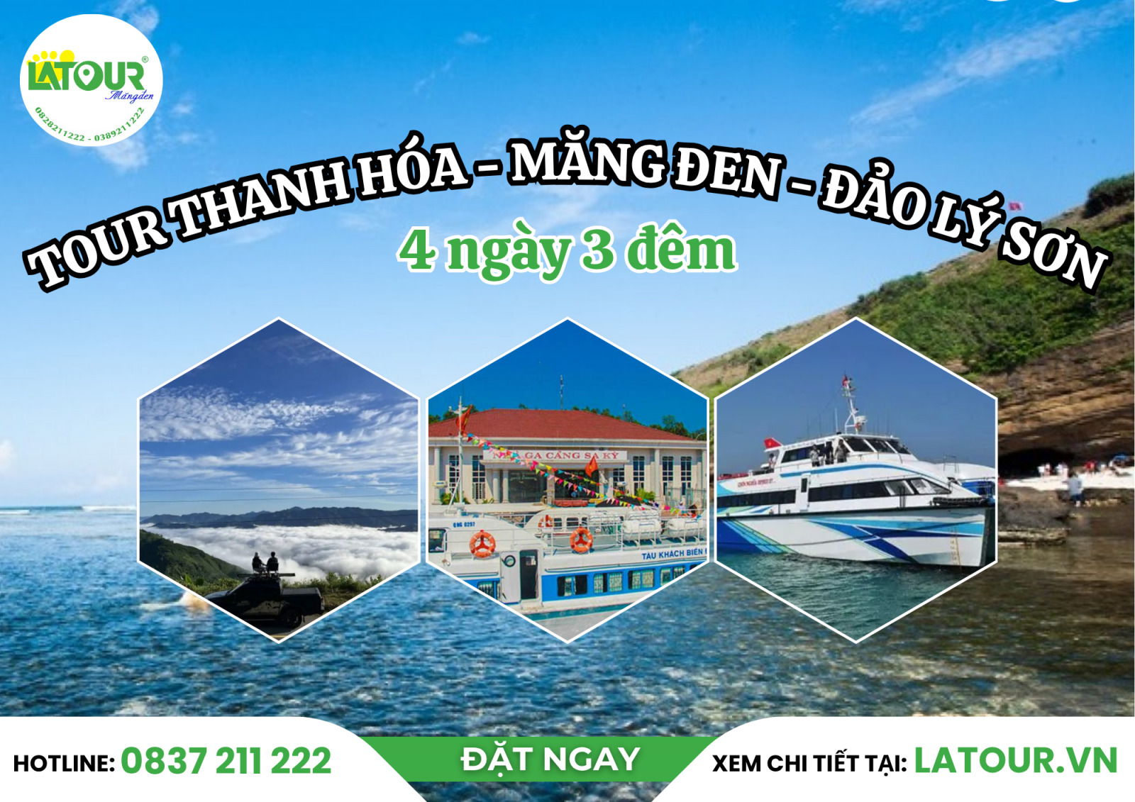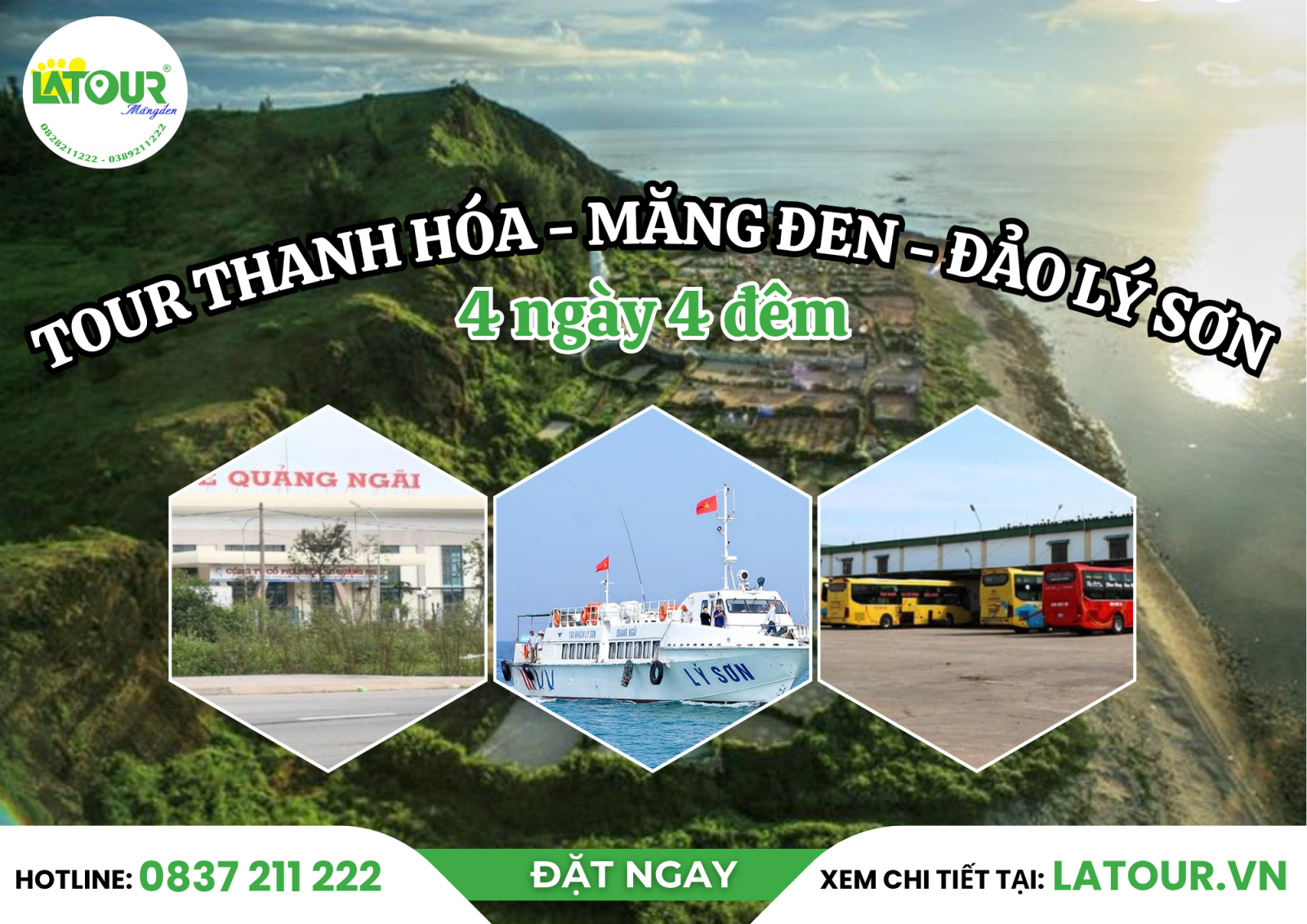 Bắt đầu từ Thanh Hóa, chuyến du lịch 4 ngày 4 đêm sẽ đưa bạn băng qua cao nguyên lộng gió đến đảo xanh giữa biển trời. Một hành trình hòa quyện giữa sắc núi Măng Đen và vị biển của Đảo Lý Sơn thật đặc biệt. Măng Đen chờ đón quý khách bằng màu xanh bất tận của rừng thông, khí hậu se lạnh và nhịp sống chậm rãi đặc trưng của vùng cao nguyên. Rời cao nguyên, Lý Sơn mở ra trước mắt với vẻ đẹp của đảo núi lửa độc đáo, bờ cát trắng mịn và mặt biển trong như tấm gương phản chiếu trời xanh. LATOUR sẽ đưa bạn chạm đến những trải nghiệm mới, từng điểm đến đều được chọn lọc kỹ lưỡng để mỗi bước chân trên hành trình đều mang lại cảm xúc riêng và một dấu ấn khó quên.