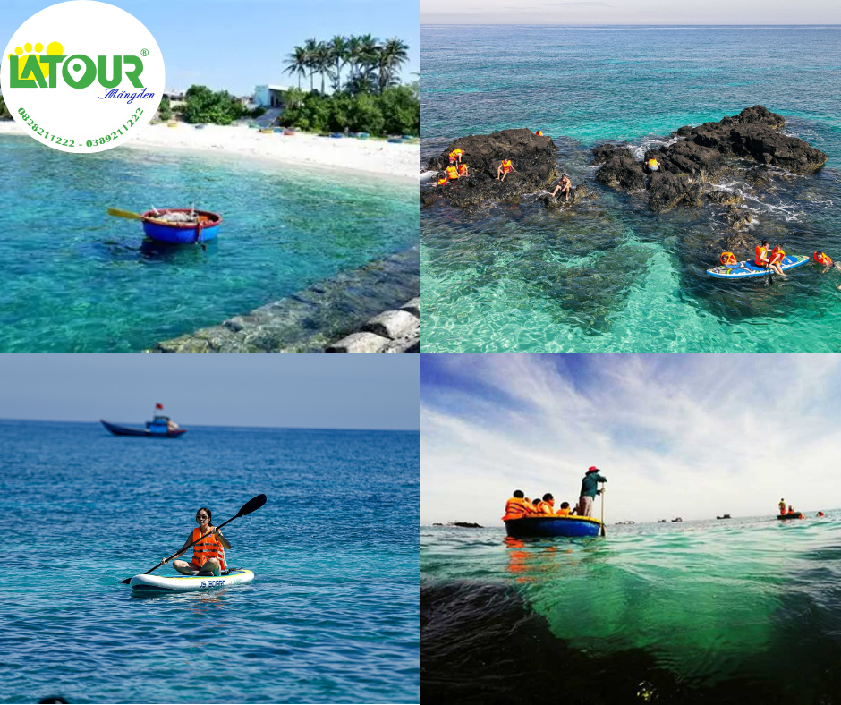 - Ngoài ra, du khách có thể trải nghiệm đi thuyền thúng ngắm san hô lung linh sắc màu quanh đảo (chi phí tự túc).