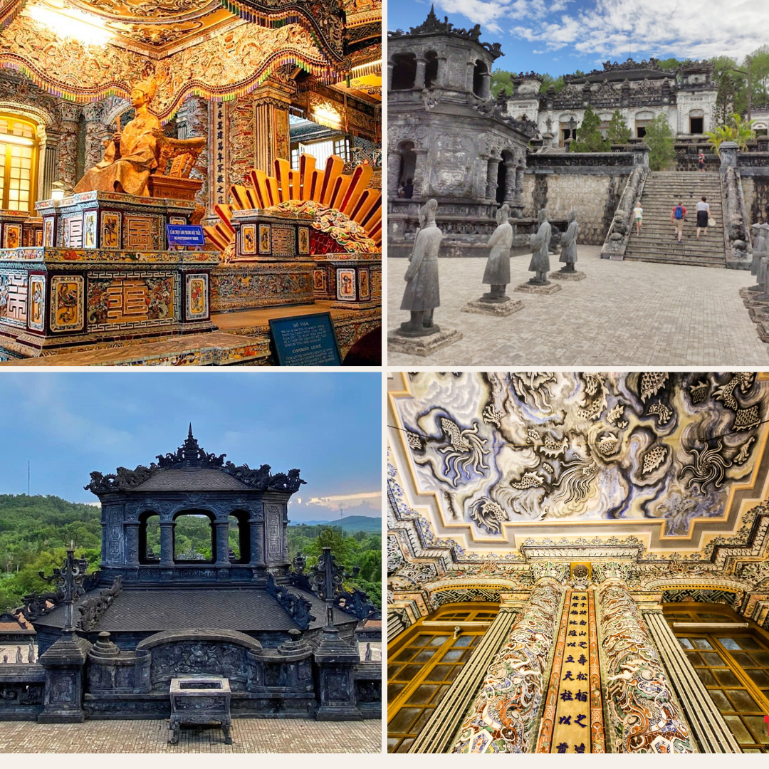 • Lăng vua Khải Định là một công trình lăng tẩm độc đáo bậc nhất ở Huế, nổi bật với sự kết hợp hài hòa giữa kiến trúc Á Đông và phong cách châu Âu hiện đại. Lăng được trang trí tinh xảo với nội thất dát vàng, khảm sành sứ, cùng những họa tiết hoa văn cầu kỳ, thể hiện sự tài hoa và gu thẩm mỹ độc đáo của vua Khải Định. Đây không chỉ là nơi an nghỉ của vị vua cuối cùng của triều Nguyễn mà còn là biểu tượng nghệ thuật kiến trúc pha trộn tinh tế, thu hút đông đảo du khách đến tham quan và chiêm ngưỡng.
